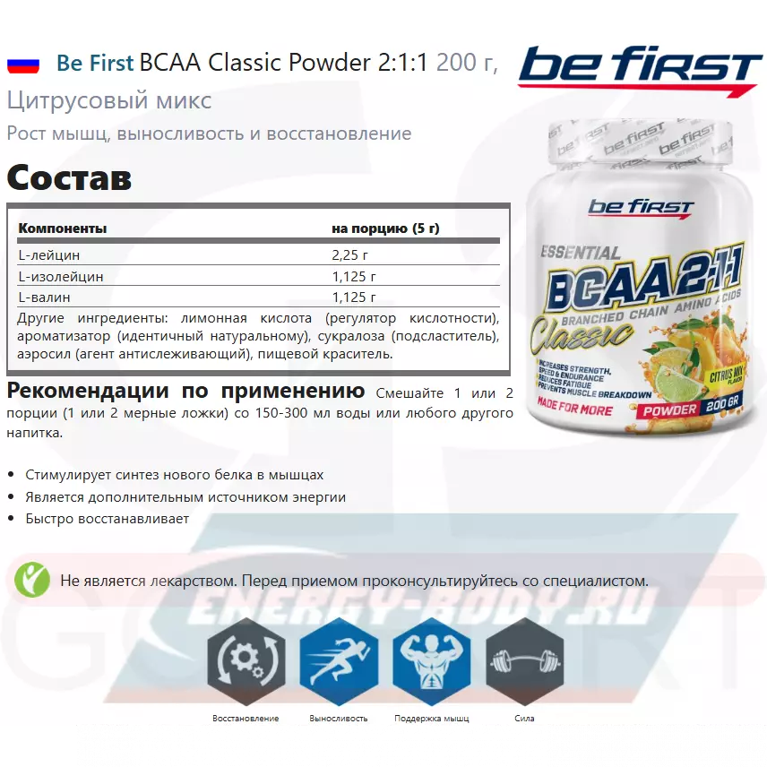 Добавка с BCAA в традиционном соотношении 2:1:1 – это полное соответствие природному соотношению этих аминокислот в составе белков. Если посмотреть на образцовые белки (сывороточный, яичный и т.п.), то соотношение лейцина к изолейцину и валину в них будет очень близким к данному. Именно так их проще всего выделить и именно так они лучше всего усваиваются организмом. Поэтому Be First BCAA 2:1:1 CLASSIC Powder – это многократно испытанная классика! BCAA с такой рецептурой применяются тысячами спортсменов по всему миру уже давно и успешно помогают им добиваться поставленных целей, наращивая мышечную массу и силовые показатели, быстро восстанавливаясь и возвращаясь к тренировкам.