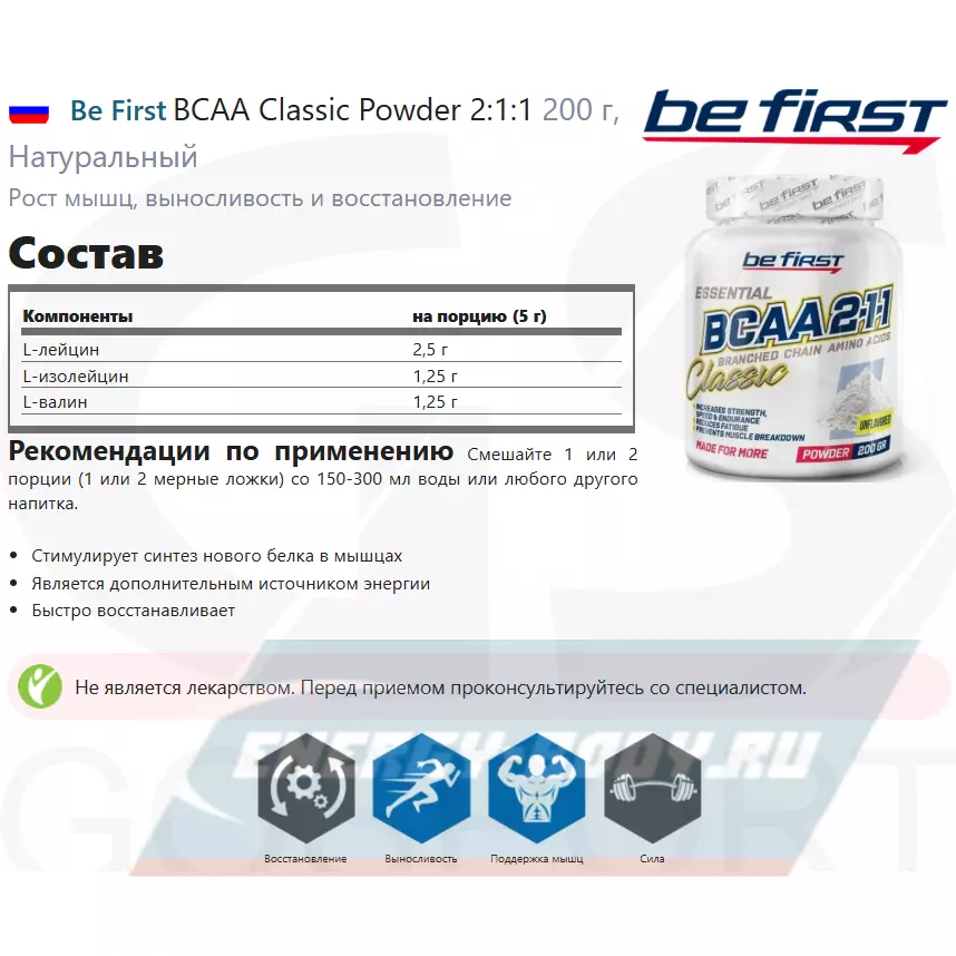 Добавка с BCAA в традиционном соотношении 2:1:1 – это полное соответствие природному соотношению этих аминокислот в составе белков. Если посмотреть на образцовые белки (сывороточный, яичный и т.п.), то соотношение лейцина к изолейцину и валину в них будет очень близким к данному. Именно так их проще всего выделить и именно так они лучше всего усваиваются организмом. Поэтому Be First BCAA 2:1:1 CLASSIC Powder – это многократно испытанная классика! BCAA с такой рецептурой применяются тысячами спортсменов по всему миру уже давно и успешно помогают им добиваться поставленных целей, наращивая мышечную массу и силовые показатели, быстро восстанавливаясь и возвращаясь к тренировкам.