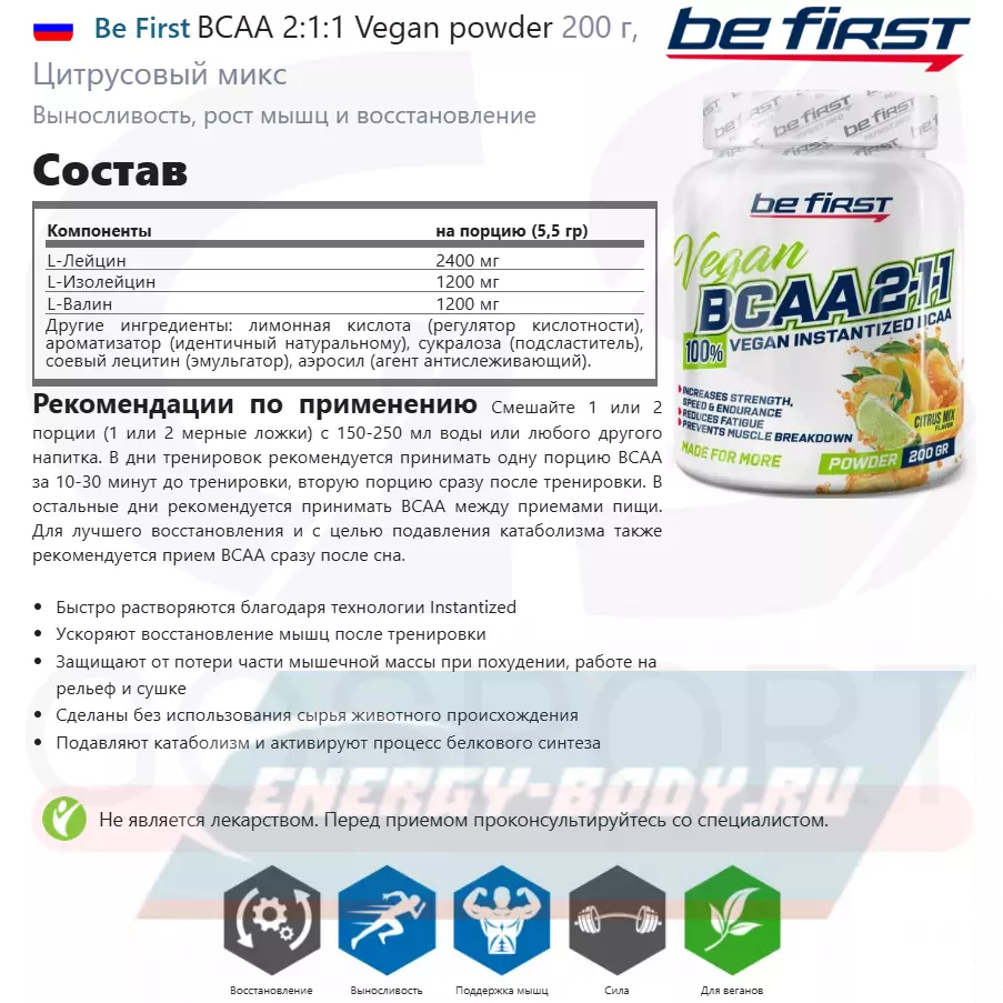 Вегетарианские BCAA от Be First – это важнейшие спортивные аминокислоты для тех, кто выбрал путь здорового питания и отказался от животной пищи. Вегетарианцам аминокислоты помогут сохранить мышцы при похудении или сушке, а также ускорить их рост при наборе массы.