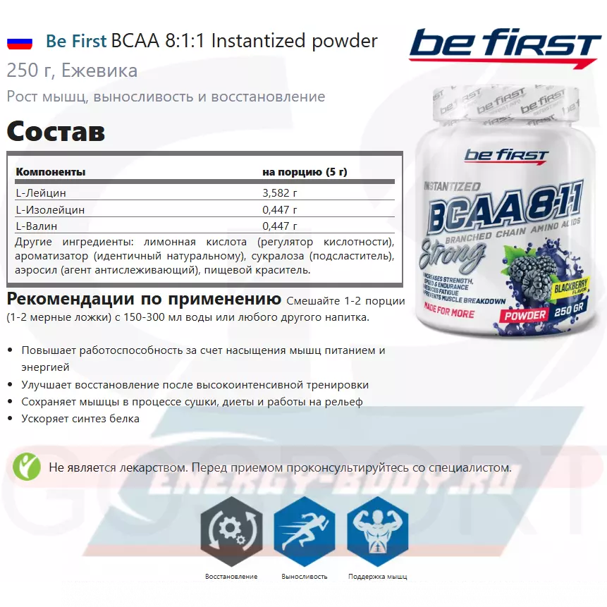 Количество лейцина здесь в 4 раза увеличено (по сравнению с традиционной формулой BCAA), чтобы добиться большей эффективности в стимуляции роста мышц и восстановлении после тренировки. Благодаря профессионально составленной рецептуре, использованию высококачественного сырья, а также применению усовершенствованной технологии “Instantized product”, аминокислоты Be First instantized BCAA 8:1:1 обладают превосходным вкусом, максимальной эффективностью и наилучшей степенью усвоения организмом.