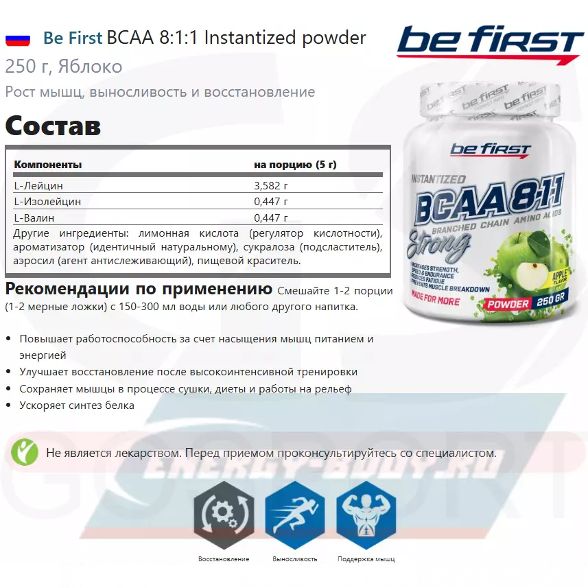 Количество лейцина здесь в 4 раза увеличено (по сравнению с традиционной формулой BCAA), чтобы добиться большей эффективности в стимуляции роста мышц и восстановлении после тренировки. Благодаря профессионально составленной рецептуре, использованию высококачественного сырья, а также применению усовершенствованной технологии “Instantized product”, аминокислоты Be First instantized BCAA 8:1:1 обладают превосходным вкусом, максимальной эффективностью и наилучшей степенью усвоения организмом.