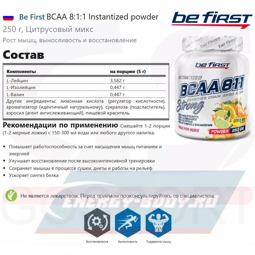 Количество лейцина здесь в 4 раза увеличено (по сравнению с традиционной формулой BCAA), чтобы добиться большей эффективности в стимуляции роста мышц и восстановлении после тренировки. Благодаря профессионально составленной рецептуре, использованию высококачественного сырья, а также применению усовершенствованной технологии “Instantized product”, аминокислоты Be First instantized BCAA 8:1:1 обладают превосходным вкусом, максимальной эффективностью и наилучшей степенью усвоения организмом.