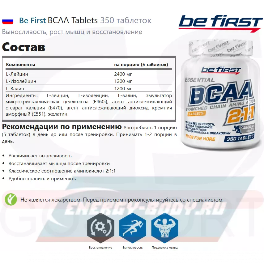 Be First BCAA 2:1:1 Tablets – аминокислотная добавка, содержащая 3 незаменимые аминокислоты с разветвленной цепью (лейцин, изолейцин, валин), и предназначенная для поддержки мышц во время силового тренинга, для ускорения их роста и повышения силовых показателей. При тренировках на рельеф и похудении BCAA тоже оказывает неоценимую помощь, сохраняя мышцы от разрушения и позволяя значительно улучшить параметры фигуры.