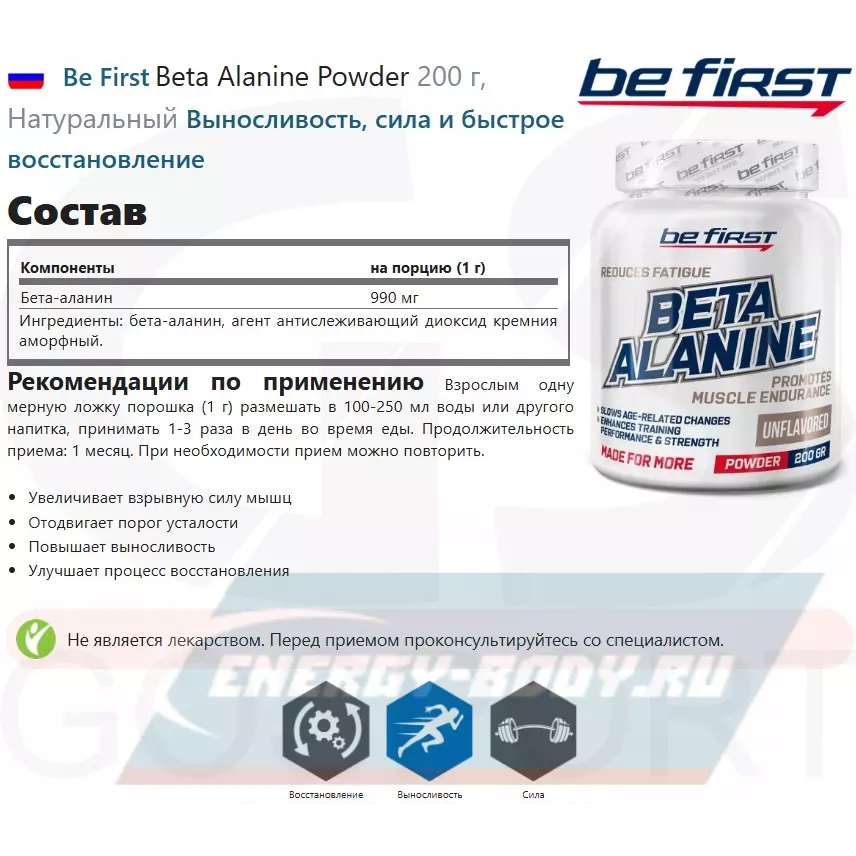 Be First Beta Alanine Powder 200 г, Натуральный — Выносливость, сила и быстрое восстановление
