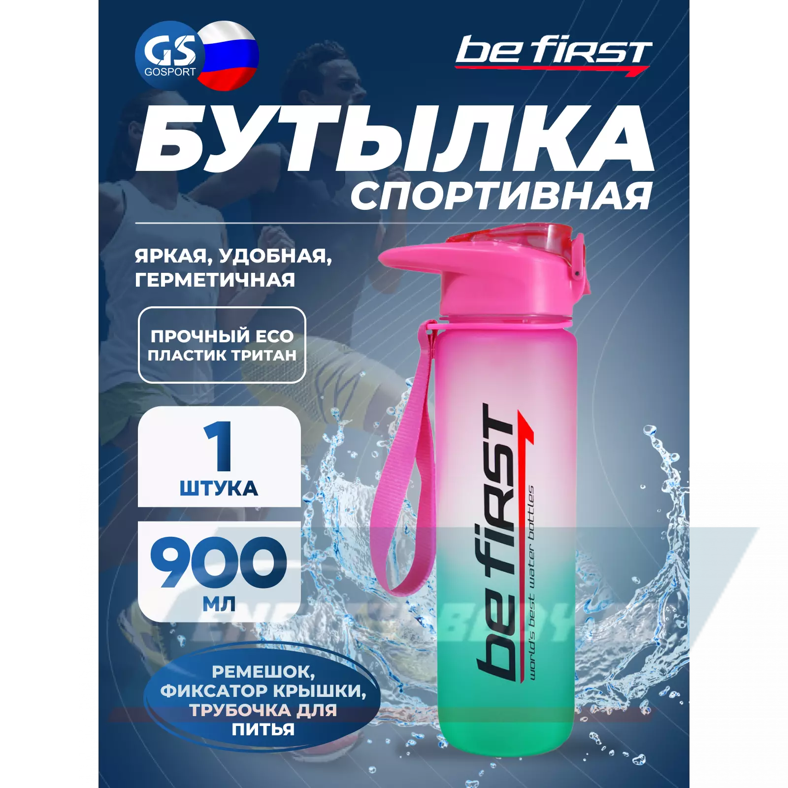 Бутылка Be First емкостью 900 мл из прочного тритана с удобным питьевым носиком и трубочкой – поможет утолить жажду в любое время.