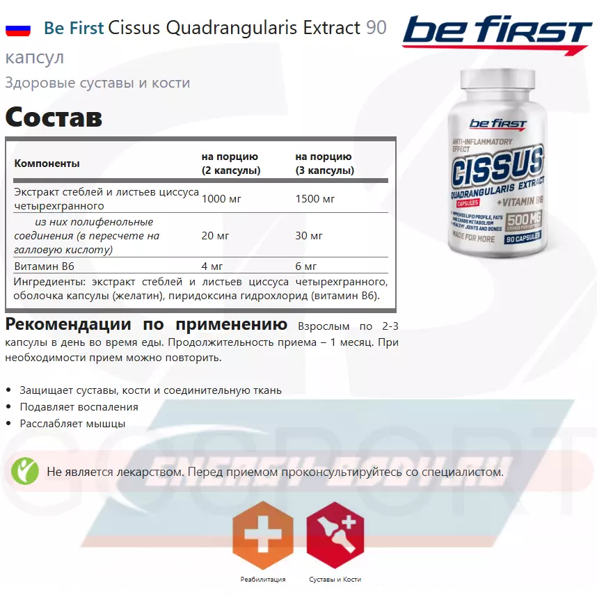 Ингредиенты: экстракт стеблей и листьев циссуса четырехгранного, оболочка капсулы (желатин), пиридоксина гидрохлорид (витамин В6).