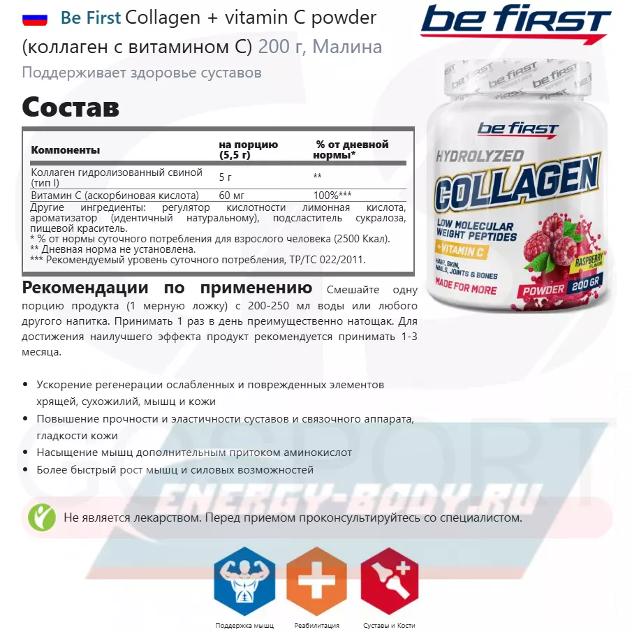 Collagen hydrolyzed + vitamin C powder от Be First содержит в составе коллаген и витамин С, являющиеся основными элементами, из которых состоит соединительная ткань нашего организма: хрящи, суставы, связки. Прием добавки поддерживает здоровье суставов при больших физических нагрузках, например, высокоинтенсивных силовых тренировках.