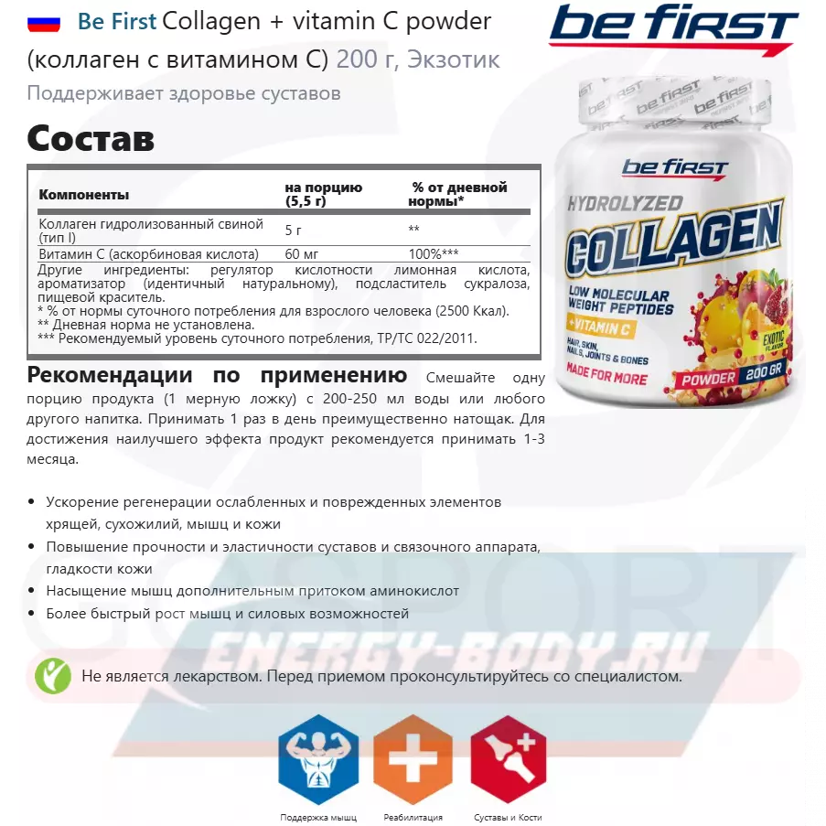 Состав Be First Collagen + vitamin C powder (коллаген с витамином С)