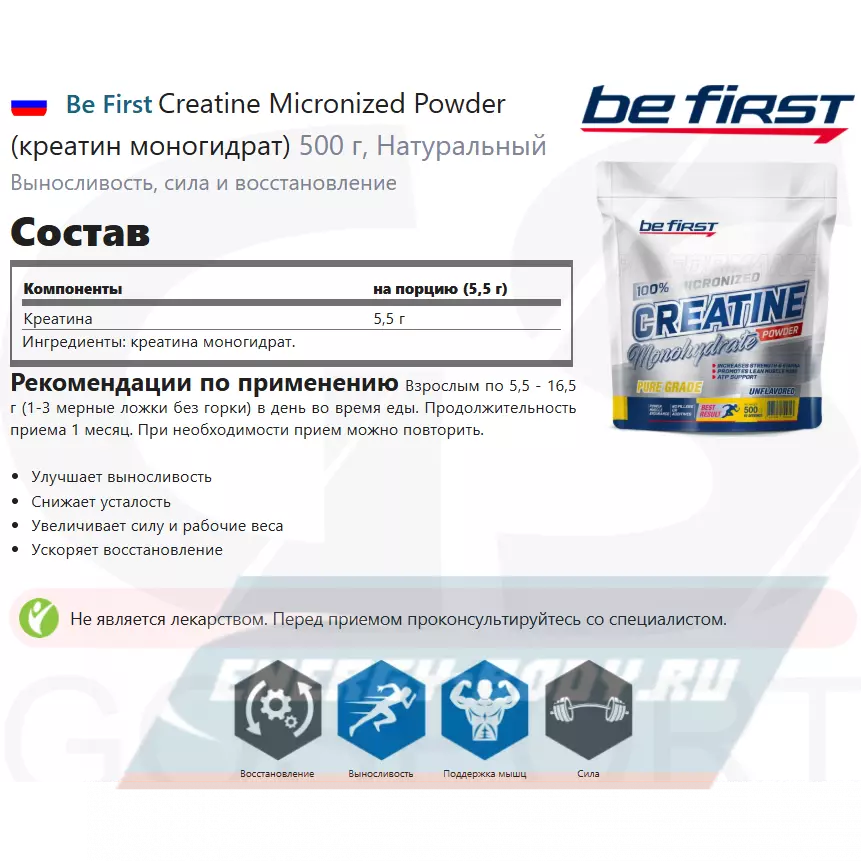 Принимая Creatine Micronized Powder Be First можно повысить взрывную силу, увеличить интенсивность тренинга, ускорить рост мышц и восстановление после тренировок.