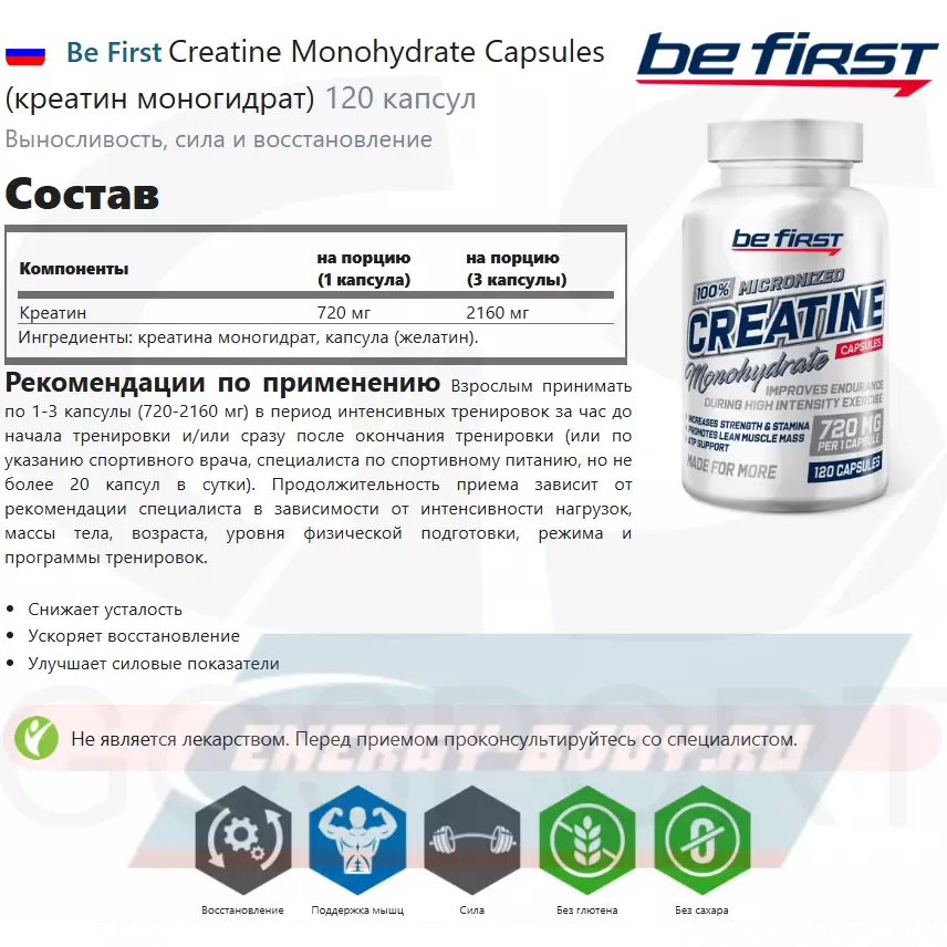 Креатина моногидрат в капсулах от Be First обеспечивает лучшее энергоснабжение работающих мышц, а, значит, более высокую интенсивность и результативность тренировочного процесса, то есть увеличение силы, рост сухой массы мышц, более быстрое возвращение к тренировкам после отдыха или реабилитации.