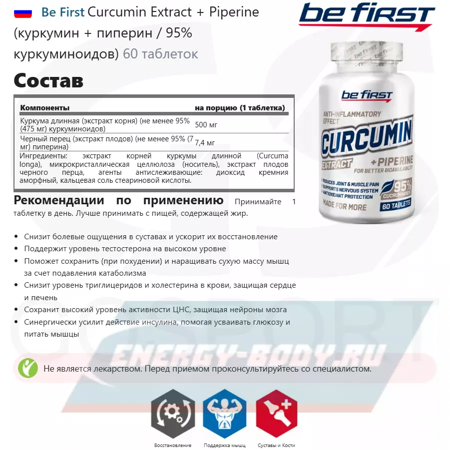 Be First Curcumin Extract + Piperine (куркумин + пиперин / 95% куркуминоидов) 60 таблеток
