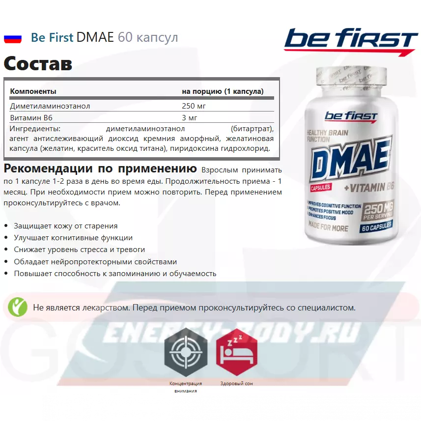 DMAE – это диметиламиноэтанол, предшественник ацетилхолина, вещество, в незначительных количествах присутствующее в нашем организме. С возрастом его выработка начинает замедляться, отчего страдают функции нервной системы – память, внимательность, сон, нервно-мышечная координация и др. Падает восприимчивость мышц к нагрузке, работоспособность, пропадает энергия, ухудшается настроение и самочувствие.