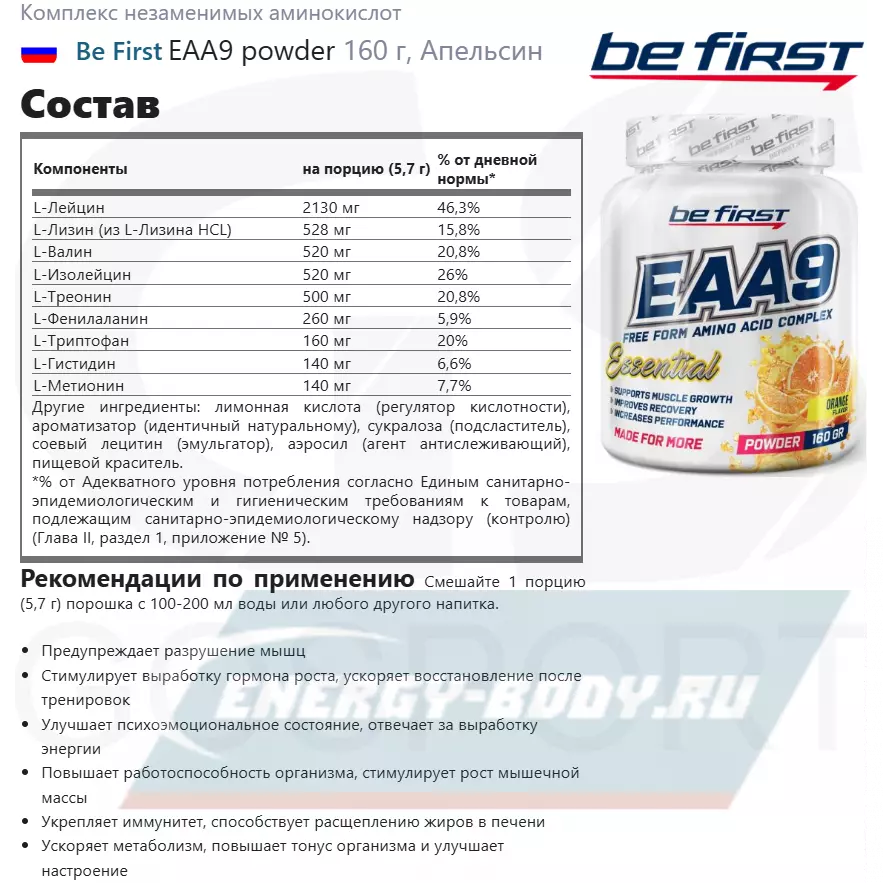 EAA – это essential amino acids, т.е. незаменимые аминокислоты. Это группа веществ, участвующих в синтезе белка. Среди протеиногенных аминокислот (входящих в состав белков) есть заменимые – которые способны синтезироваться организмом из других, и незаменимые – которые могут быть получены только из пищи, добавок или внутривенного введения. Таких незаменимых аминокислот существует 9, все они входят в состав добавки EAA9 от Be First.
