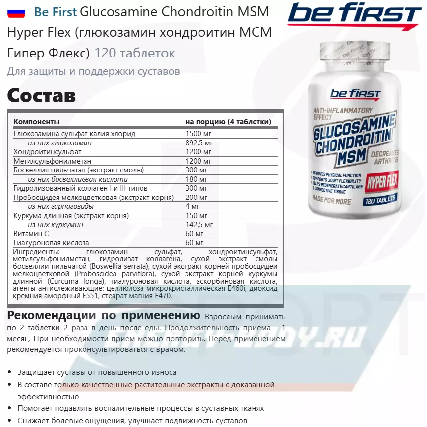 Состав Be First Glucosamine Chondroitin MSM Hyper Flex (глюкозамин хондроитин МСМ Гипер Флекс)