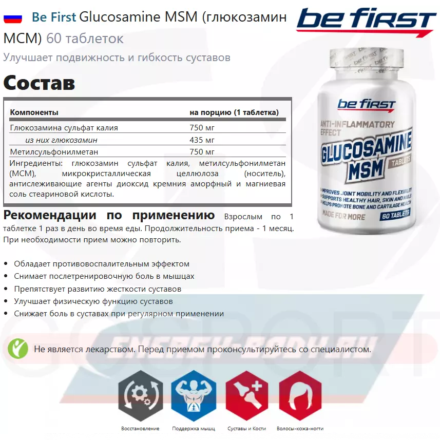 Be First Glucosamine MSM (глюкозамин МСМ) 60 таблеток — Улучшает подвижность и гибкость суставов