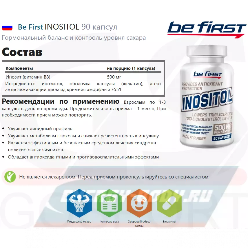 Ингредиенты: инозитол, оболочка капсулы (желатин), агент антислеживающий диоксид кремния аморфный Е551.