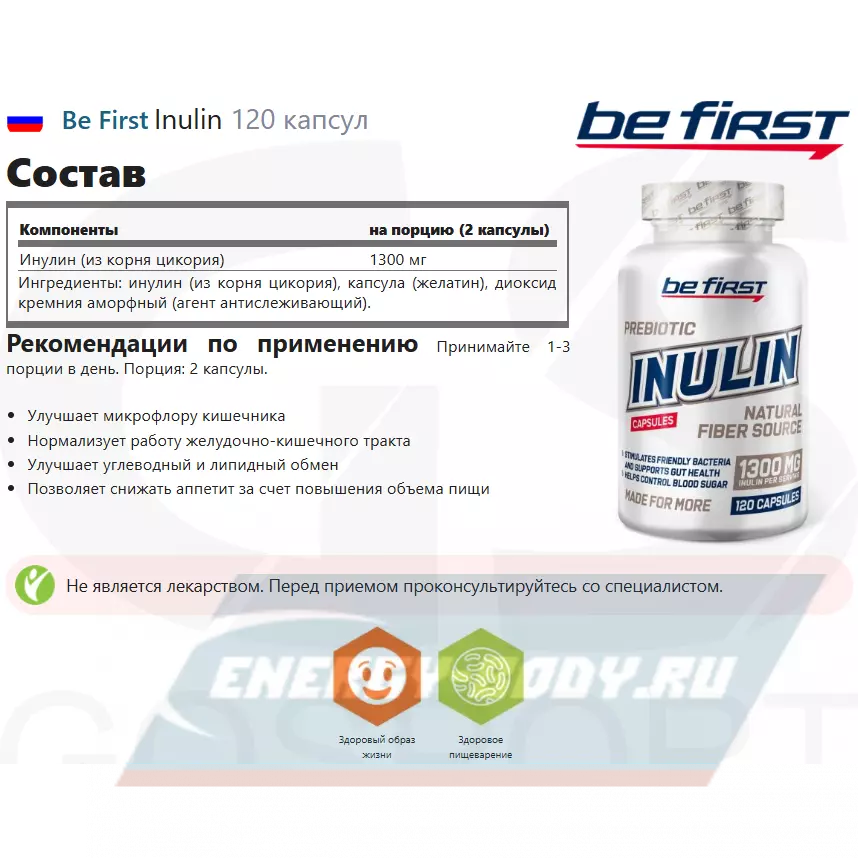 Ингредиенты: инулин (из корня цикория), капсула (желатин), диоксид кремния аморфный (агент антислеживающий).