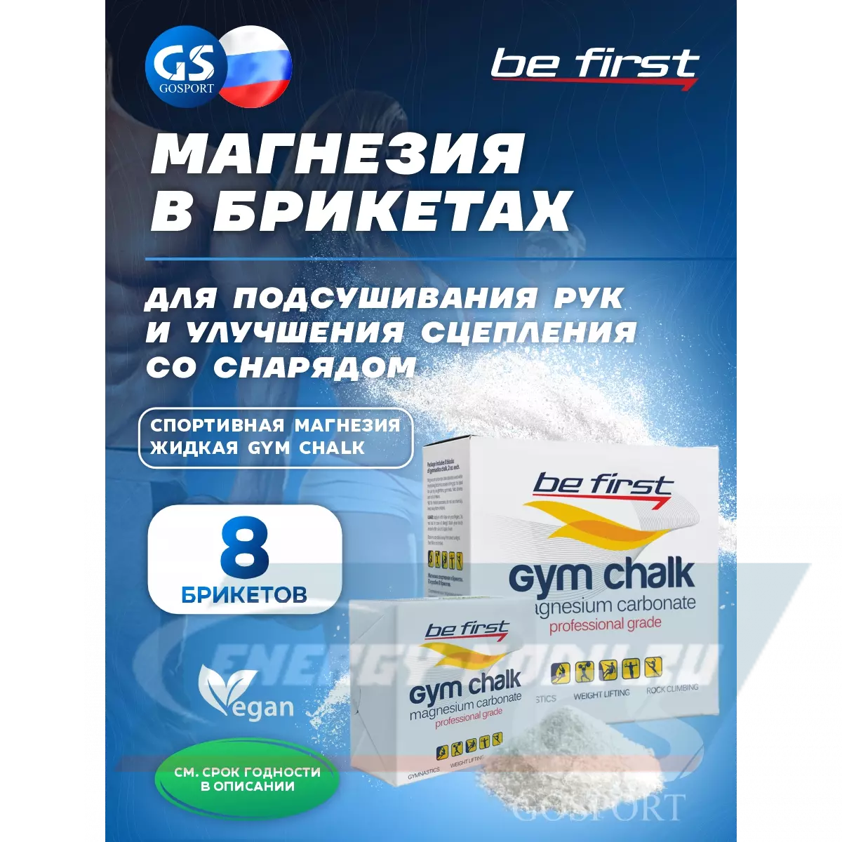 Спортивная магнезия Be First – это белый порошок, состоящий в основном из карбоната магния и предназначенный для подсушивания рук, а также улучшения их сцепления со снарядом при занятиях гимнастикой, тяжелой атлетикой, спортивным альпинизмом и другими видами спорта. Магнезия несколько снижает потоотделение в области ладоней и впитывает пот, увеличивая трение, за счет чего намного снижается вероятность проскальзывания ладоней на грифе или перекладине. Таким образом уменьшается вероятность получить травму, а также исключается необходимость тратить лишние усилия и внимание на удержание снаряда в руках – и, следовательно, повышается эффективность тренировок.
