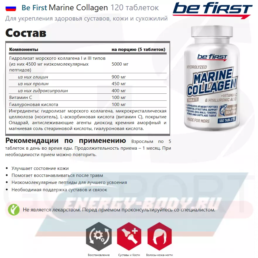 Главное действующее вещество добавки Marine Collagen от Be First – рыбный коллаген I типа. В нашем организме коллаген – главный структурный белок соединительной ткани, т.е. он составляет основу сухожилий, кожи, стенок сосудов и входит в состав практически всех органов. От скорости синтеза коллагена зависит состояние всего организма. Например, при распространенной в прошлом болезни цинге (вызванной недостатком витамина С, требующегося для выработки коллагена) соединительные ткани начинают разрушаться, что вызывает мышечную слабость, боли в суставах, расшатывание зубов, множественные кровоизлияния и т.д.