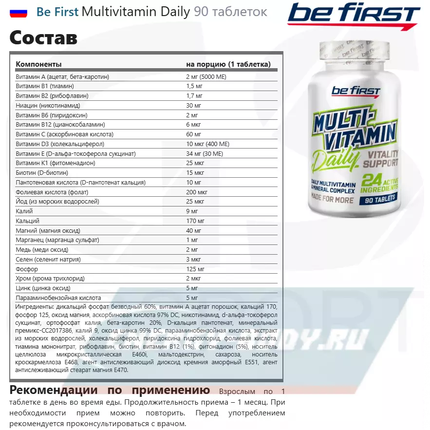 Витаминно-минеральный комплекс Multivitamin Daily от Be First – это витамины на каждый день. Добавка рассчитана на устранение нехватки витаминов и восстановление минерального баланса в организме, и предназначена как для спортсменов, так и для всех людей, практикующих активный образ жизни, либо занятых тяжелым трудом. Она поддержит иммунитет и поможет противостоять вирусным инфекциям.