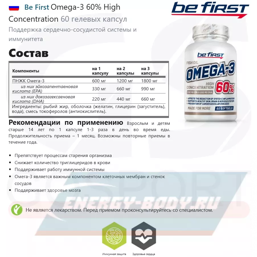 Омега-3 с концентрацией 60 % – полиненасыщенные жирные кислоты, являющиеся незаменимыми для нашего организма. Они стабилизируют состояние гормональной системы, улучшают состояние сердечнососудистой системы, суставов и кожи, поддерживают иммунитет, питают нервную систему и противодействуют процессам старения. Содержание активных веществ в добавке увеличено, что намного повышает ее эффективность.
