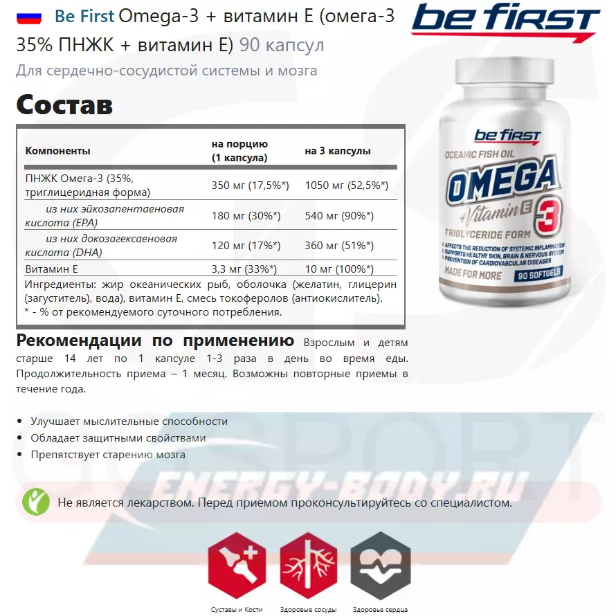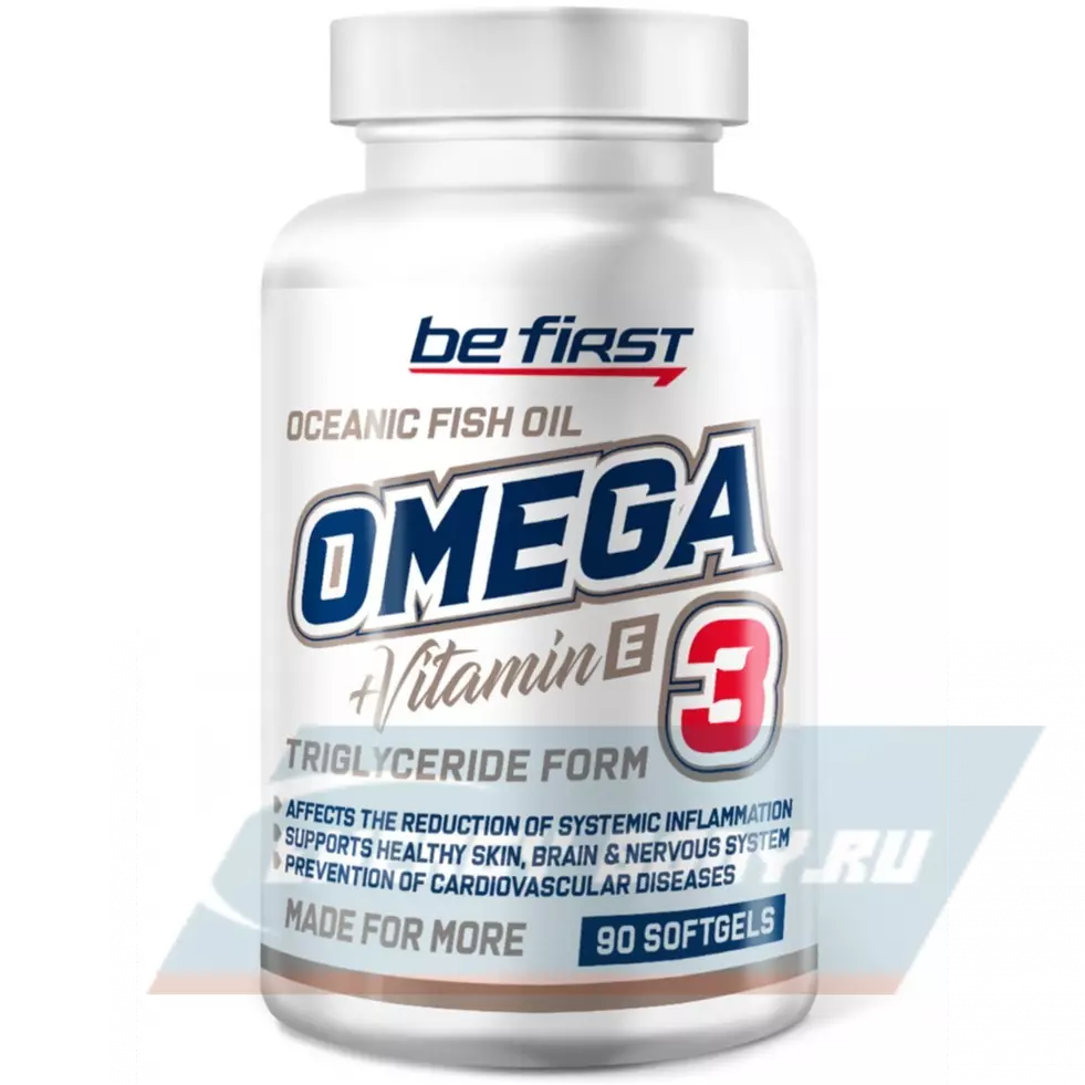 Be First OMEGA-3 + Витамин Е – продукт, состоящий из полиненасыщенных жирных кислот: α-eicosapentaenoic acid (EPA) и docosahexaenoic acid (DHA), обогащенный витамином Е.