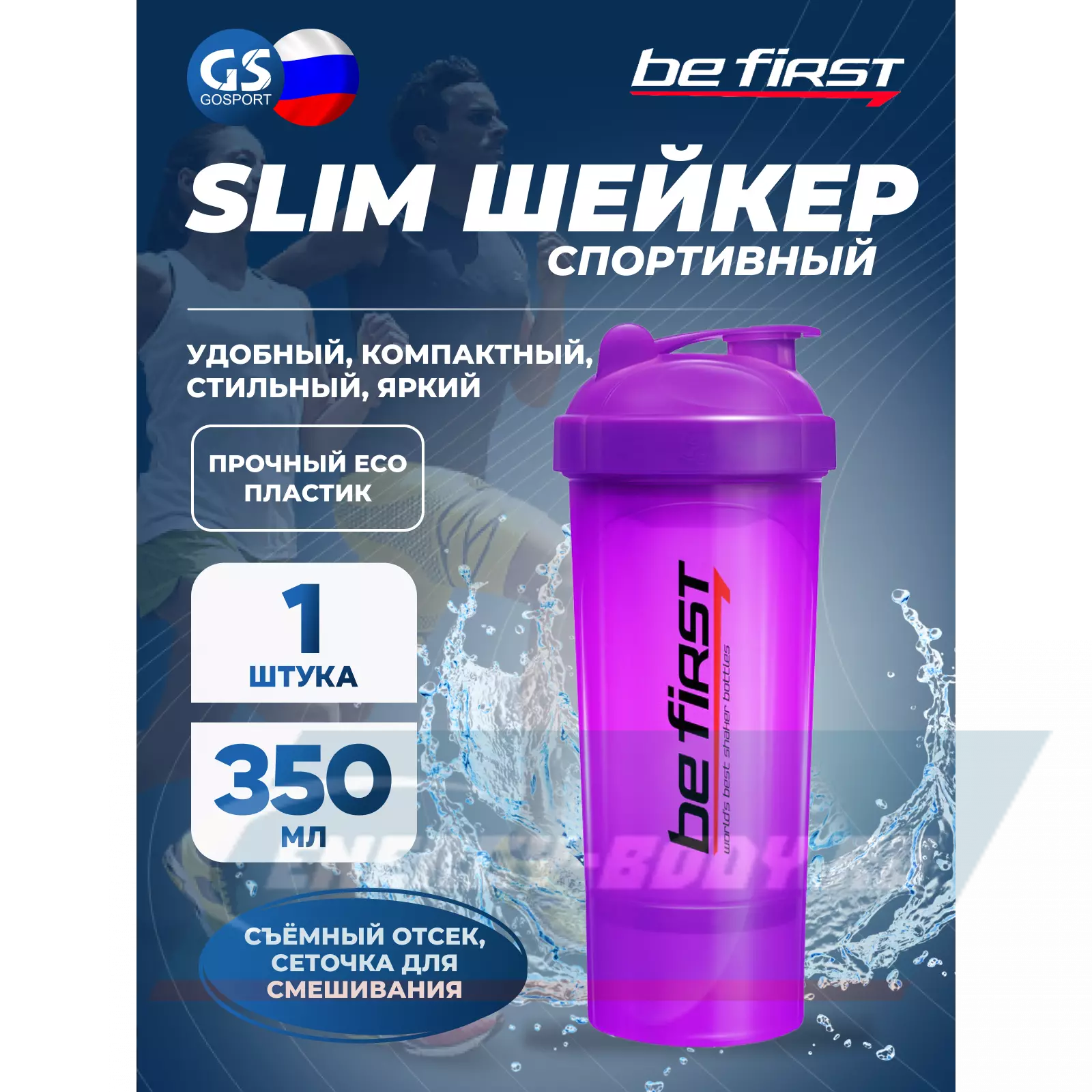 Очень изящный спортивный шейкер Be First удобного компактного размера объемом 350 мл. Корпус тонкий (или, точнее узкий) — даже самой хрупкой даме будет удобно держать его в руке. Полупрозрачный — уровень жидкости будет видно (и для этого есть мерная шкала), а вот что там намешано — останется Вашим секретом. Пластиковых шейкер выпускается в вариантах насыщенных ярких расцветок. Крышка округлая, на резьбе, с удобным небольшим носиком овальной формы. Носик закрывается жесткой защелкивающейся крышечкой, закрепленной на крышке шейкера, так что она не потеряется. Несмотря на то, что носик не имеет резьбы, закрывается он очень плотно — ничего не прольется.