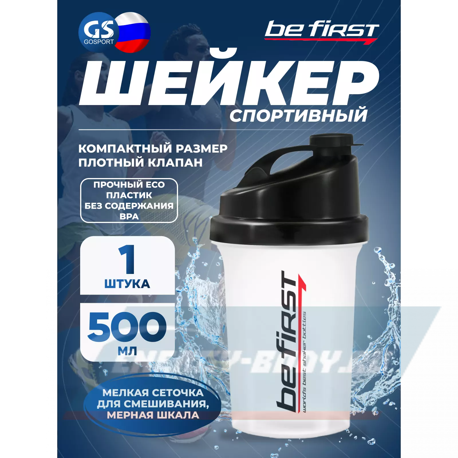 Компактный спортивный шейкер на 500 мл от Be First из пищевого ECO пластика, в котором можно смешать протеин, гейнер, аминокислоты, изотоник, креатин или что-то еще. Корпус полупрозрачный, бесцветный, с двух сторон имеет плоские прозрачные полоски, на которые нанесена мерная шкала в мл и унциях. Крышка закручивающаяся, имеет овальный носик для питья, закрываемый жестко закрепленным на крышке клапаном. Внутри — мелкая сетка в квадратных ячейках. Со стороны корпуса ее фиксируют 4 небольших выступа, для фиксации сеточки для смешивания.