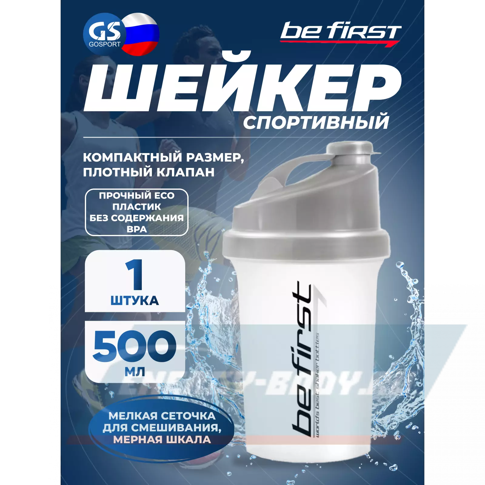 Компактный спортивный шейкер на 500 мл от Be First из пищевого ECO пластика, в котором можно смешать протеин, гейнер, аминокислоты, изотоник, креатин или что-то еще. Корпус полупрозрачный, бесцветный, с двух сторон имеет плоские прозрачные полоски, на которые нанесена мерная шкала в мл и унциях. Крышка закручивающаяся, имеет овальный носик для питья, закрываемый жестко закрепленным на крышке клапаном. Внутри — мелкая сетка в квадратных ячейках. Со стороны корпуса ее фиксируют 4 небольших выступа, для фиксации сеточки для смешивания.