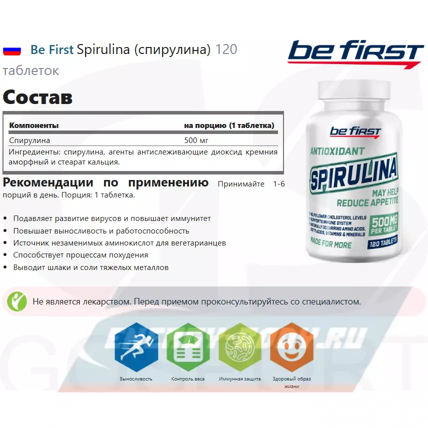 Ингредиенты: спирулина, агенты антислеживающие диоксид кремния аморфный и стеарат кальция.