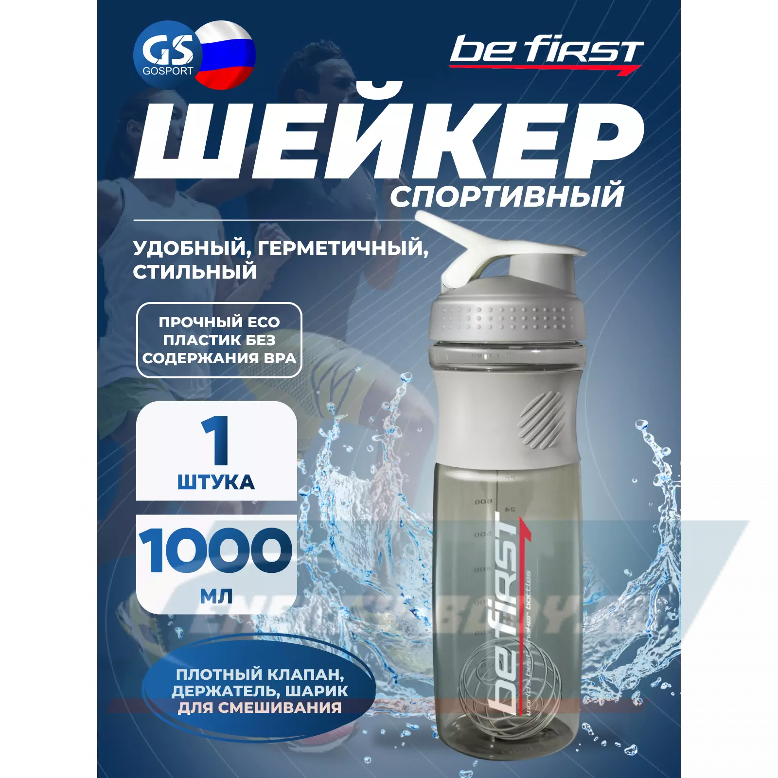 Корпус у пластикового шейкера на 1000 мл довольно длинный и изящный – на первый взгляд даже не скажешь, что в него помещается столько жидкости. Он полностью прозрачный, что позволяет видеть объем наливаемой жидкости.