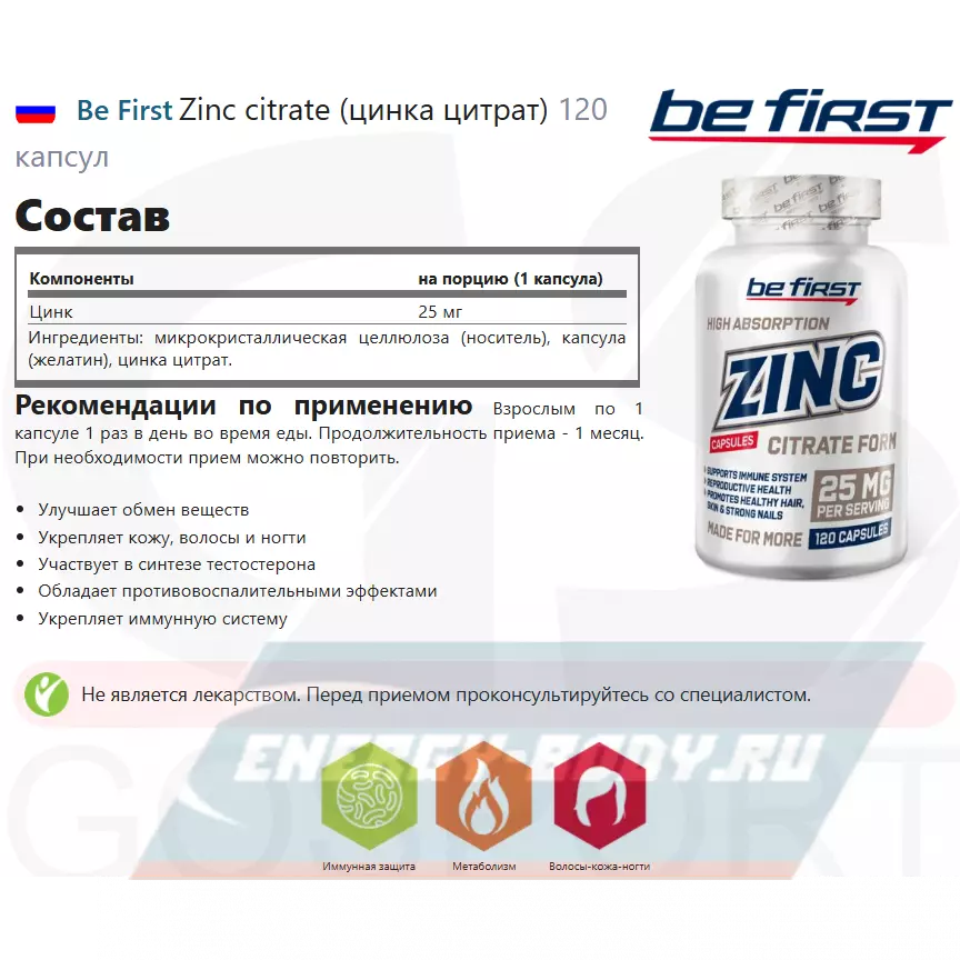 Ингредиенты: микрокристаллическая целлюлоза (носитель), капсула (желатин), цинка цитрат.