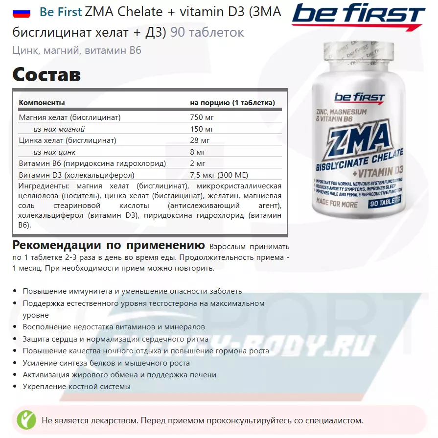 Состав Be First ZMA Chelate + vitamin D3 (ЗМА бисглицинат хелат + Д3)