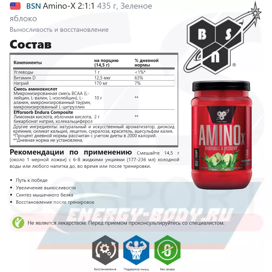Для серьезных спортсменов, которые знают о том, как важно, чтобы мышцы хорошо восстанавливались. AminoX — это формула без кофеина, содержащая 10 г смеси аминокислот, включая аминокислоты с разветвленной цепью (2:1:1), а также L-аланин, таурин и L-цитруллин, которые способствуют синтезу белка в мышцах после каждой тренировки.