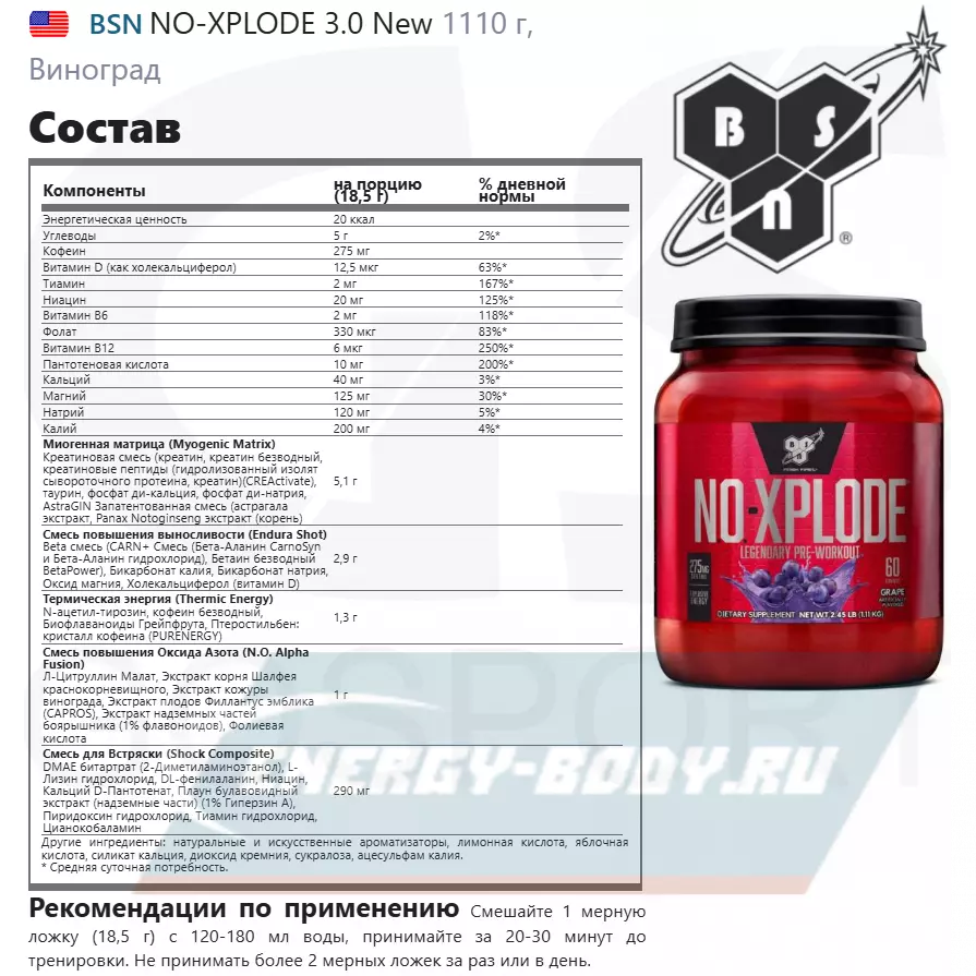 Наполните свое тело энергией из высококачественных ингредиентов, которые помогут вам превзойти свои прошлые результаты. Комплекс N.O.-Xplode разработан учеными для снабжения взрывной энергией, повышения концентрации, максимального роста мышц, силовых показателей и выносливости во время тренировки.