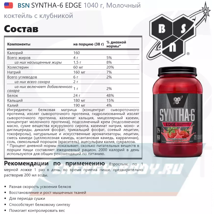 Syntha-6 EDGE от BSN – это протеин высокого качества для периода сушки. Он обладает превосходным вкусом. В его формуле присутствуют разные виды белков, которые налаживают подпитку мышц ценными нутриентами в течение долгого времени. Это все формы сывороточного белка, молочный концентрат, мицеллярный казеин, казеинат кальция, а также соевый белок. Каждый из названных протеинов по-своему полезен для организма, и не только за счет высокого уровня аминокислот. Их ценность состоит в том, что усваиваются они с разной скоростью.