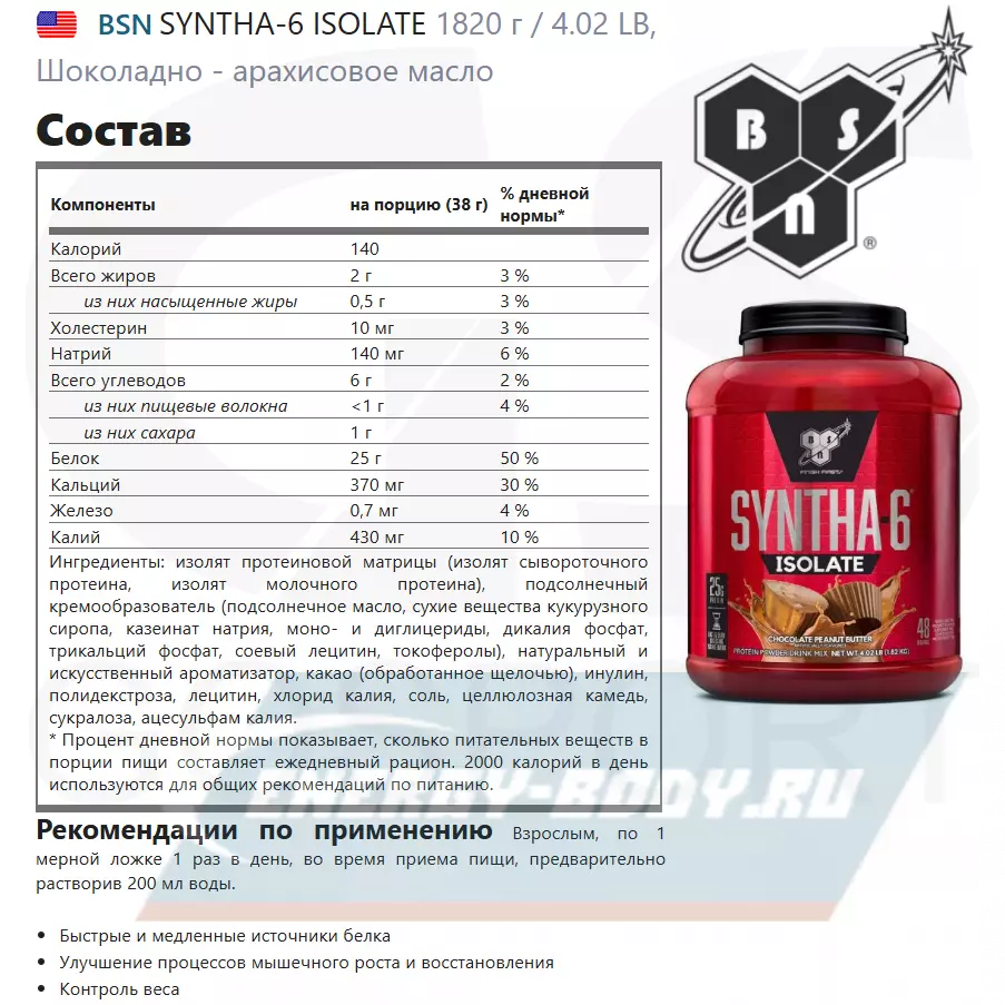 Многофункциональная белковая матрица Syntha-6 Isolate идеально подходит для применения между приемами пищи и перед сном, т.к. данный протеин характеризуется относительно низким содержанием калорий. И если вы ищете для себя протеин, который бы совмещал в себе инновации, премиум качества белки с широким аминокислотным профилем, а также высокие вкусовые качества, то вам идеально подойдет BSN Syntha-6 Isolate.