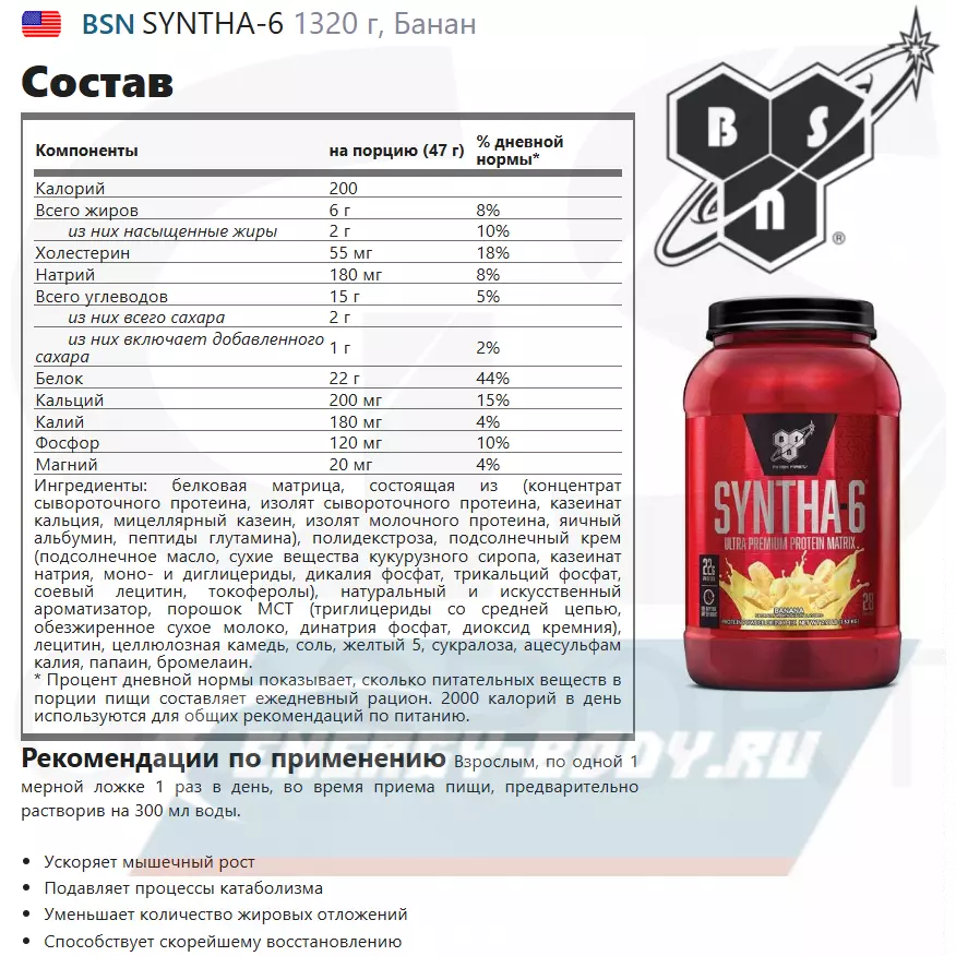 Использовать, как добавку к вашему повседневному питанию, смешайте 1 мерную ложку SYNTHA-6 с 120-150 мл. холодной воды или любого другого напитка на ваш выбор. Варьируйте количество жидкости, чтобы достичь нужного вам вкуса и консистенции. Принимайте в соответствии с вашей потребностью в протеине. Чтобы увеличить количество белка в порции и получить восхитительный вкус молочного коктейля, смешивайте продукт с нежирным или обезжиренным молоком. Не превышайте рекомендуемую дозировку. Продукт не должен использоваться, как замена полноценного питания. Прекратите прием продукта, если почувствуете отклонения от нормального состояния здоровья.