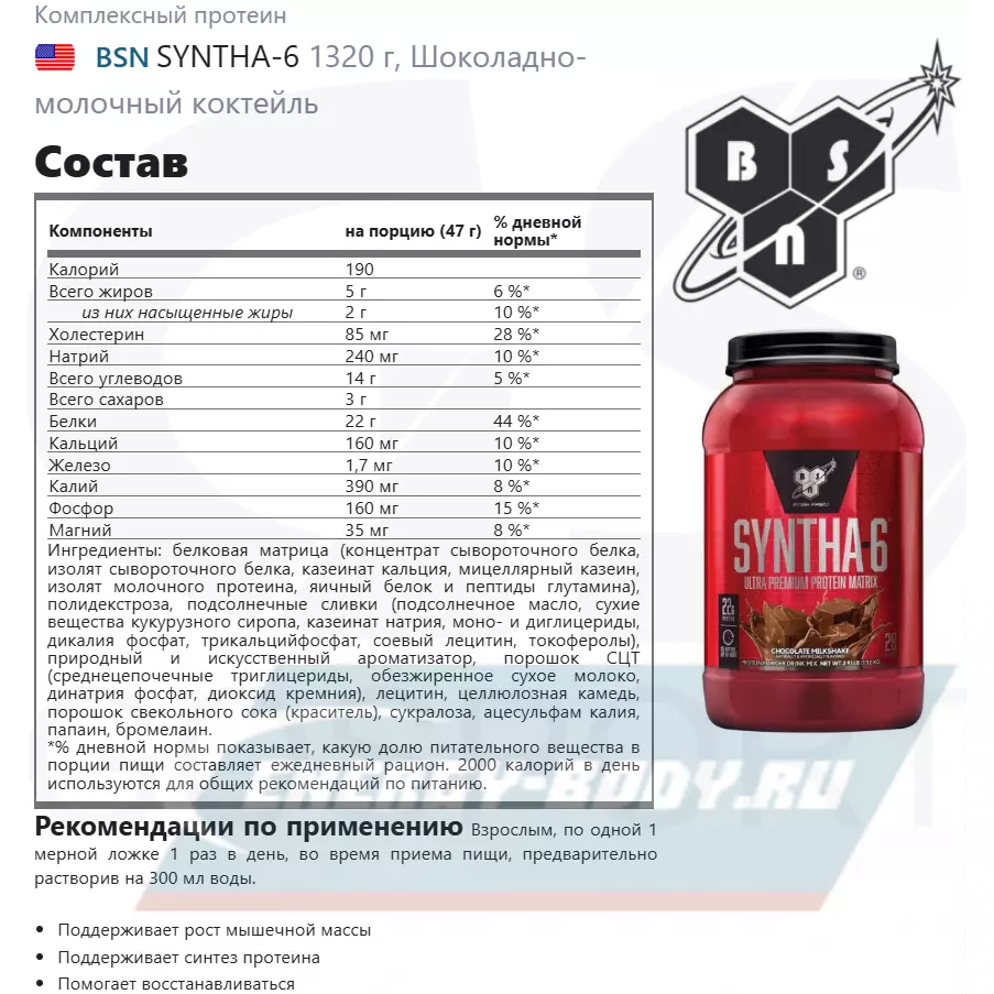 Использовать, как добавку к вашему повседневному питанию, смешайте 1 мерную ложку SYNTHA-6 с 120-150 мл. холодной воды или любого другого напитка на ваш выбор. Варьируйте количество жидкости, чтобы достичь нужного вам вкуса и консистенции. Принимайте в соответствии с вашей потребностью в протеине. Чтобы увеличить количество белка в порции и получить восхитительный вкус молочного коктейля, смешивайте продукт с нежирным или обезжиренным молоком. Не превышайте рекомендуемую дозировку. Продукт не должен использоваться, как замена полноценного питания. Прекратите прием продукта, если почувствуете отклонения от нормального состояния здоровья.