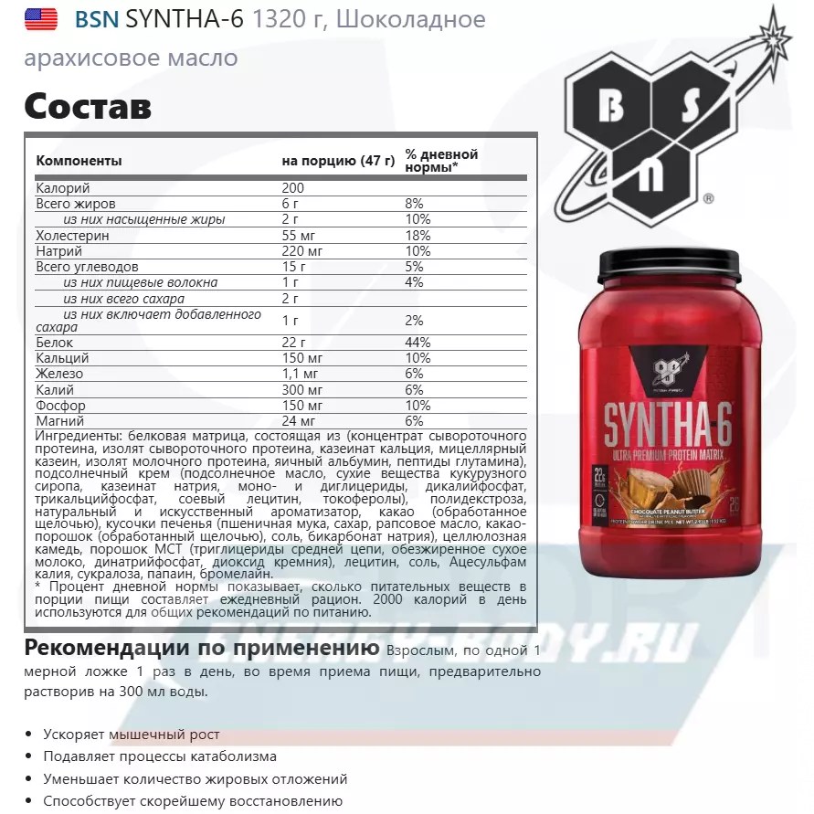 Использовать, как добавку к вашему повседневному питанию, смешайте 1 мерную ложку SYNTHA-6 с 120-150 мл. холодной воды или любого другого напитка на ваш выбор. Варьируйте количество жидкости, чтобы достичь нужного вам вкуса и консистенции. Принимайте в соответствии с вашей потребностью в протеине. Чтобы увеличить количество белка в порции и получить восхитительный вкус молочного коктейля, смешивайте продукт с нежирным или обезжиренным молоком. Не превышайте рекомендуемую дозировку. Продукт не должен использоваться, как замена полноценного питания. Прекратите прием продукта, если почувствуете отклонения от нормального состояния здоровья.