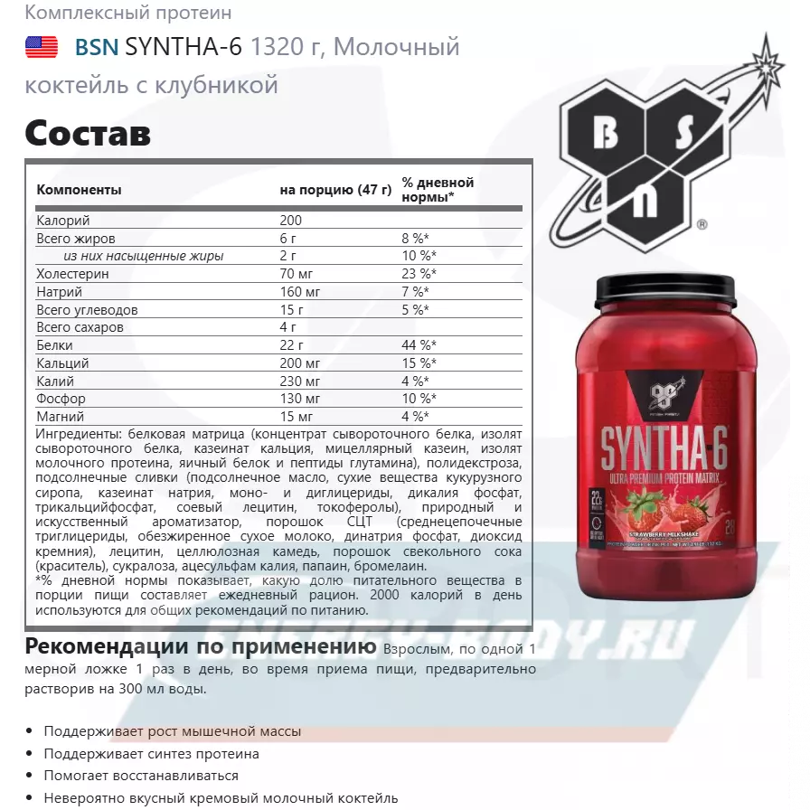Использовать, как добавку к вашему повседневному питанию, смешайте 1 мерную ложку SYNTHA-6 с 120-150 мл. холодной воды или любого другого напитка на ваш выбор. Варьируйте количество жидкости, чтобы достичь нужного вам вкуса и консистенции. Принимайте в соответствии с вашей потребностью в протеине. Чтобы увеличить количество белка в порции и получить восхитительный вкус молочного коктейля, смешивайте продукт с нежирным или обезжиренным молоком. Не превышайте рекомендуемую дозировку. Продукт не должен использоваться, как замена полноценного питания. Прекратите прием продукта, если почувствуете отклонения от нормального состояния здоровья.