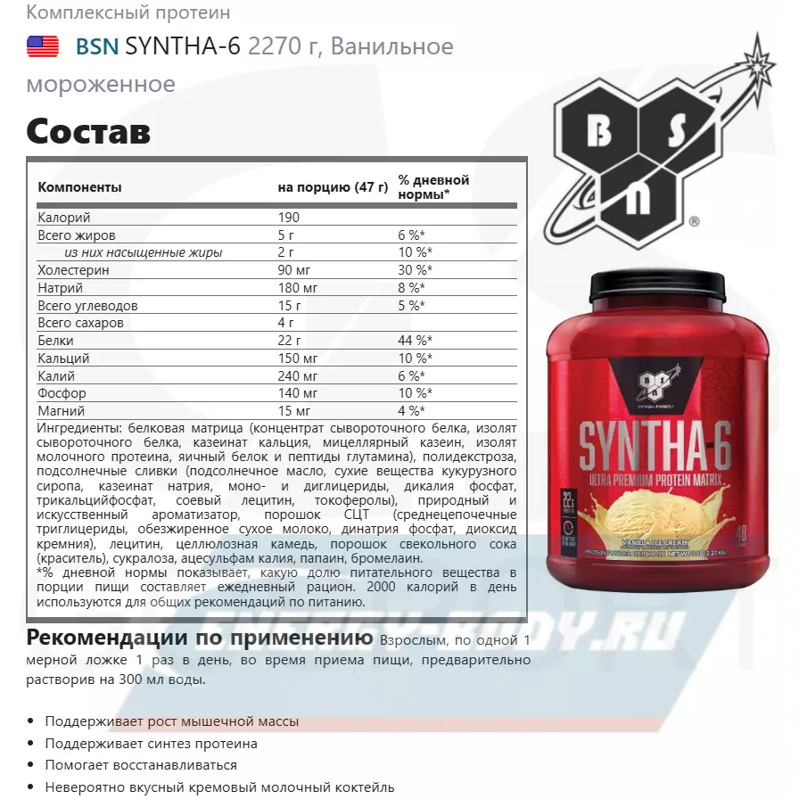 Syntha-6 – это комплексная пищевая добавка из протеина, разработанная компанией BSN. Этот препарат считается одним из самых известных и популярных на рынке спортивного питания. Основу протеинового комплекса составляют 6 разновидностей белков, отличающихся различной степенью усвоения. Это означает, что с помощью одной порции Syntha-6 удастся обеспечить мышечные ткани аминокислотами и питательными веществами на более длительный период времени. Syntha-6 от BSN является пищевой добавкой высокого класса, что могут засвидетельствовать многие спортсмены.