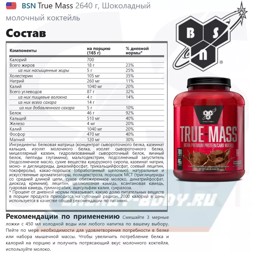 Использовать как добавку к вашему повседневному питанию, смешайте 3 мерные ложки True-Mass с 480 мл. холодной воды или любого напитка на ваш вкус. Варируйте количество воды, чтобы достичь нужной вам консистенции. Принимайте 1 порцию в день или в соответствии с вашей потребностью в протеине или гейнере. Чтобы увеличить количество калорий и белка в порции и получить восхитительный вкус молочного коктейля, смешивайте с молоком. Не превышайте рекомендуемую дозировку. Продукт не должен использоваться, как замена полноценного питания. Прекратите прием продукта, если почувствуете отклонения от нормального состояния здоровья.