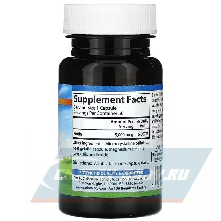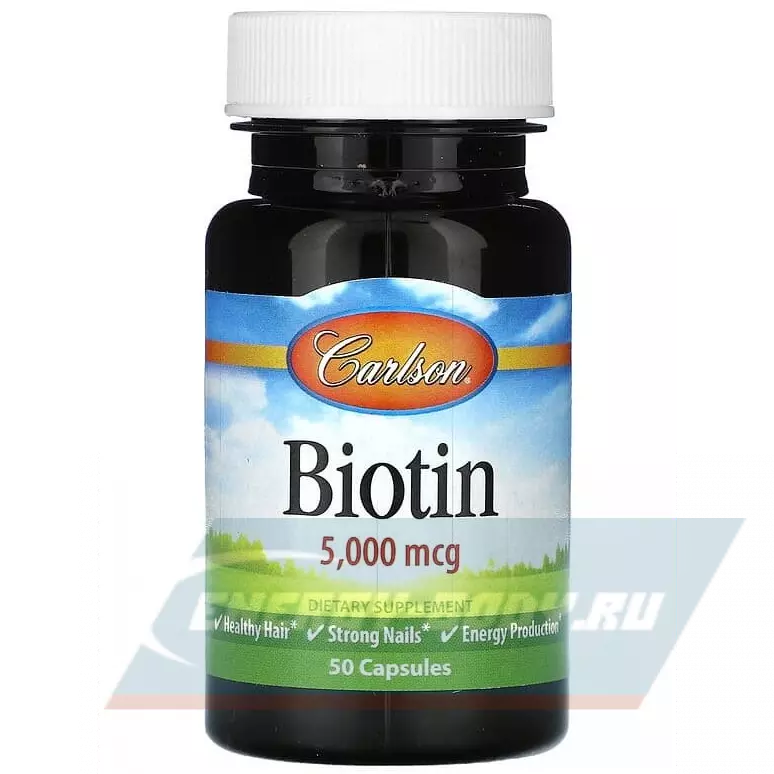 Выглядите и чувствуйте себя лучше с отмеченным наградами Carlson Biotin. Биотин, также известный как витамин B-7, является одним из восьми важных витаминов комплекса B. Биотин поддерживает производство энергии; играет роль во многих метаболических функциях нашего организма; и помогает питать здоровые волосы, кожу и ногти. Поскольку биотин не синтезируется организмом, мы должны получать его с пищей или добавками. Одна капсула содержит 5000 мкг биотина.