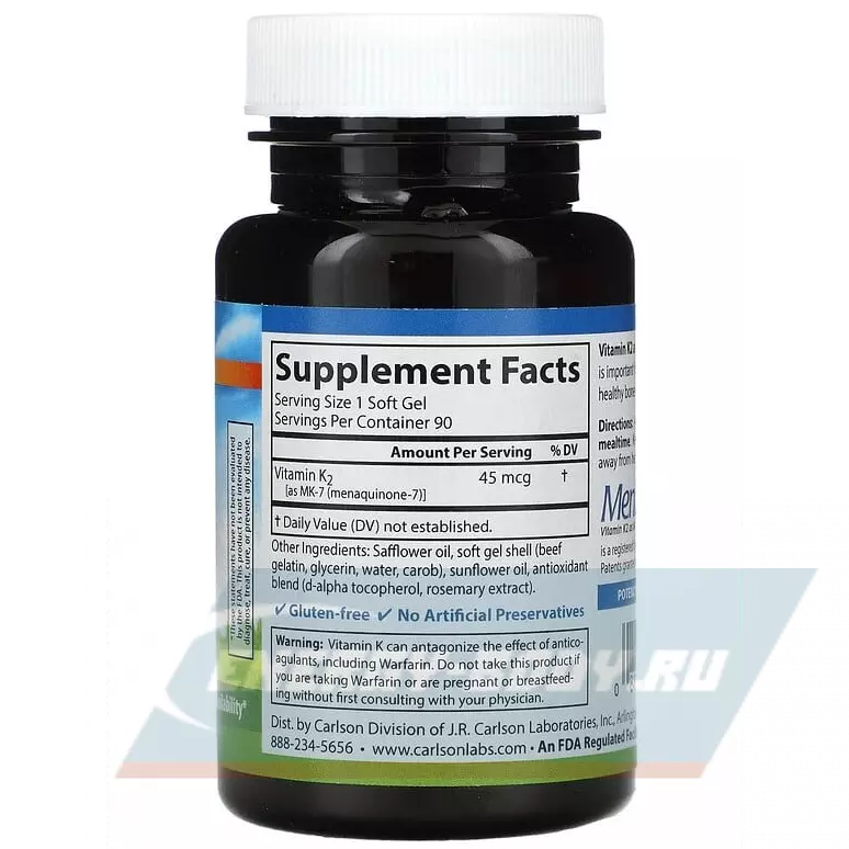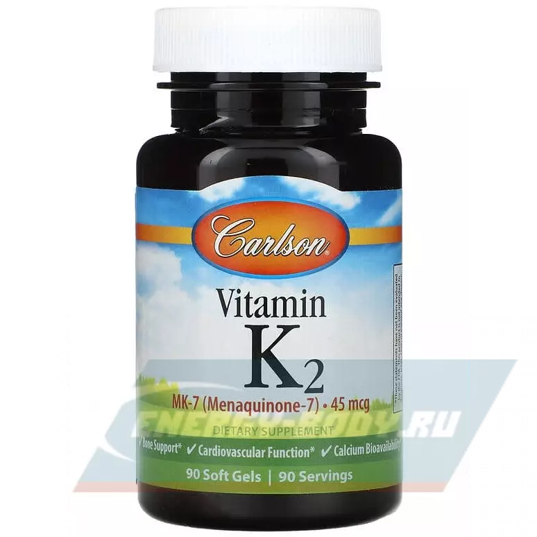 Витамин K2 от Carlson в виде MK-7 изготовлен из MenaQ7, единственного MK-7, клинически изученного и доказавшего свою эффективность в отношении костной и сердечно-сосудистой системы.
