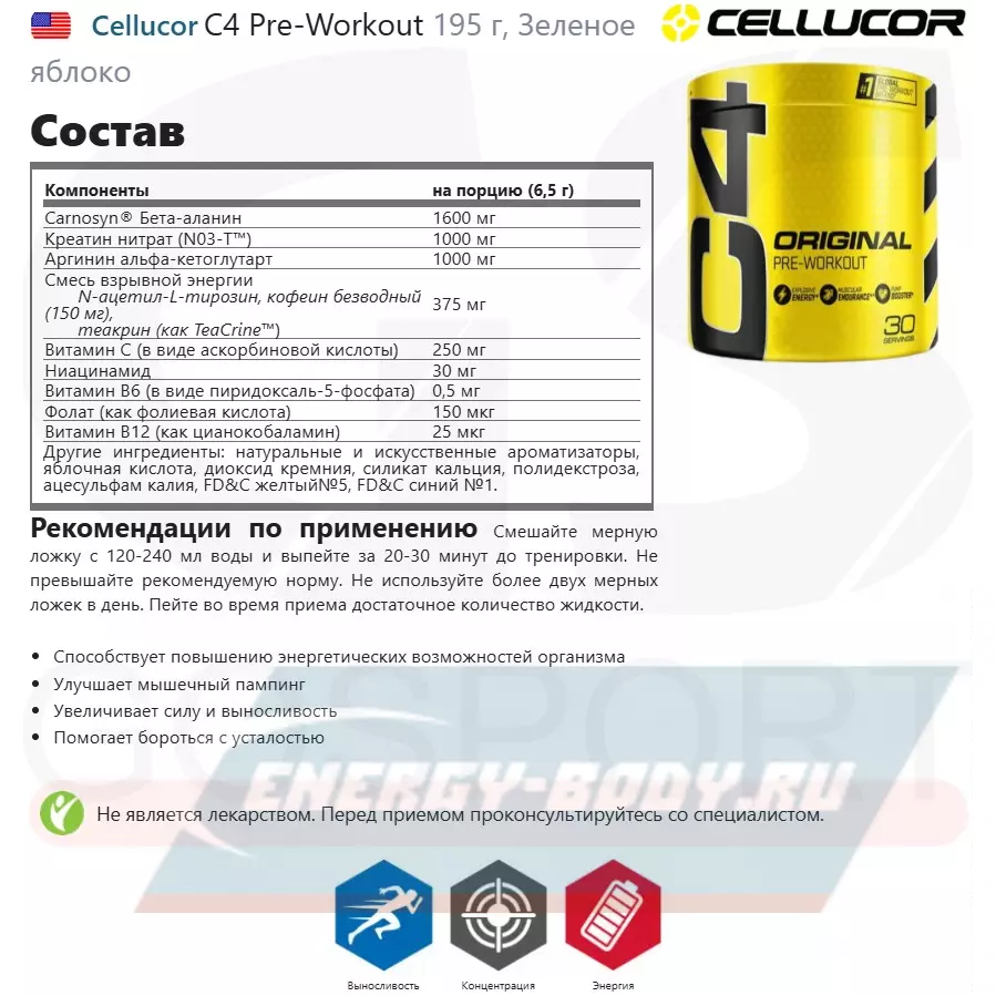 Смешайте одну порцию (примерно 1 мерную ложку) C4 Original с 180 мл воды (6 жидких унций) и выпивайте за 20–30 минут до тренировки. Не превышайте 1 мерную ложку в день.