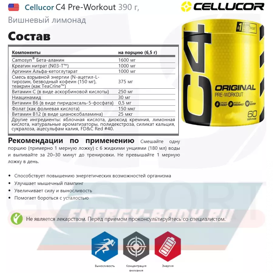 Смешайте одну порцию (примерно 1 мерную ложку) C4 Original с 180 мл воды (6 жидких унций) и выпивайте за 20–30 минут до тренировки. Не превышайте 1 мерную ложку в день.