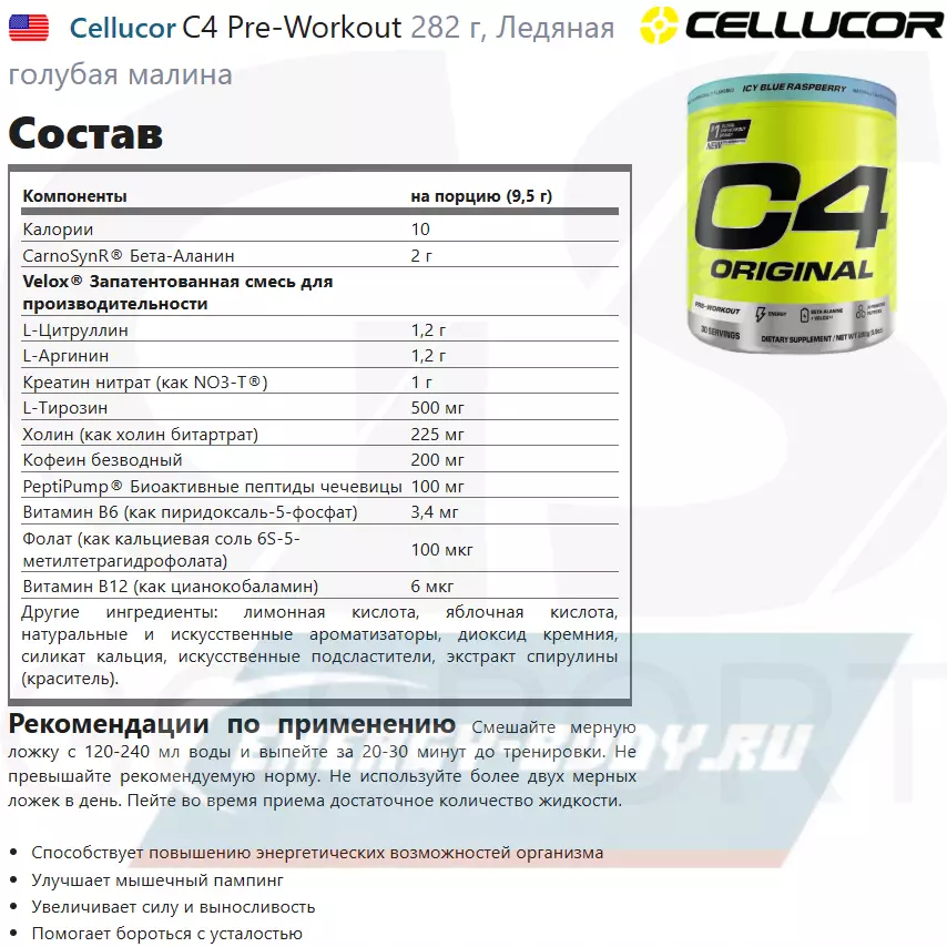 Смешайте одну порцию (примерно 1 мерную ложку) C4 Original с 180 мл воды (6 жидких унций) и выпивайте за 20–30 минут до тренировки. Не превышайте 1 мерную ложку в день.