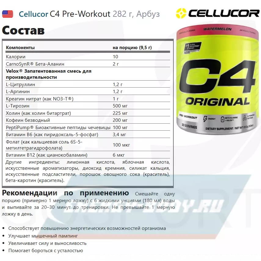 Смешайте одну порцию (примерно 1 мерную ложку) C4 Original с 180 мл воды (6 жидких унций) и выпивайте за 20–30 минут до тренировки. Не превышайте 1 мерную ложку в день.