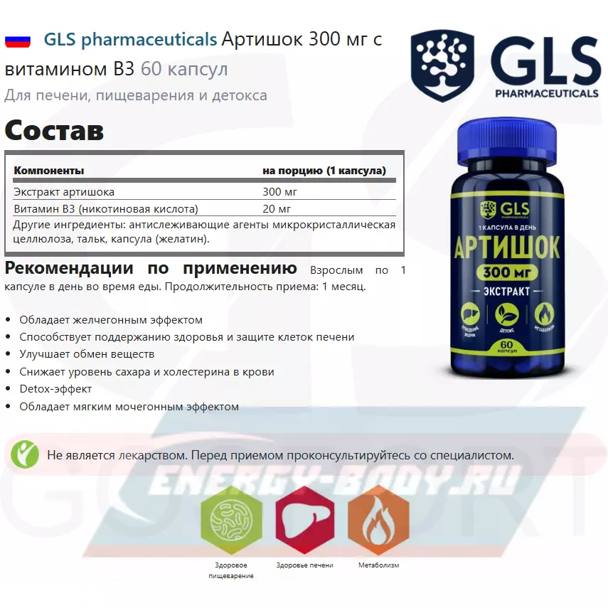 GLS pharmaceuticals Артишок 300 мг с витамином В3 60 капсул — Для печени, пищеварения и обмена веществ
